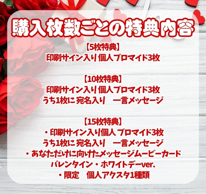 15枚特典 印刷サイン入り個人ブロマイド3枚(うち1枚に 宛名入り 一言メッセージ)